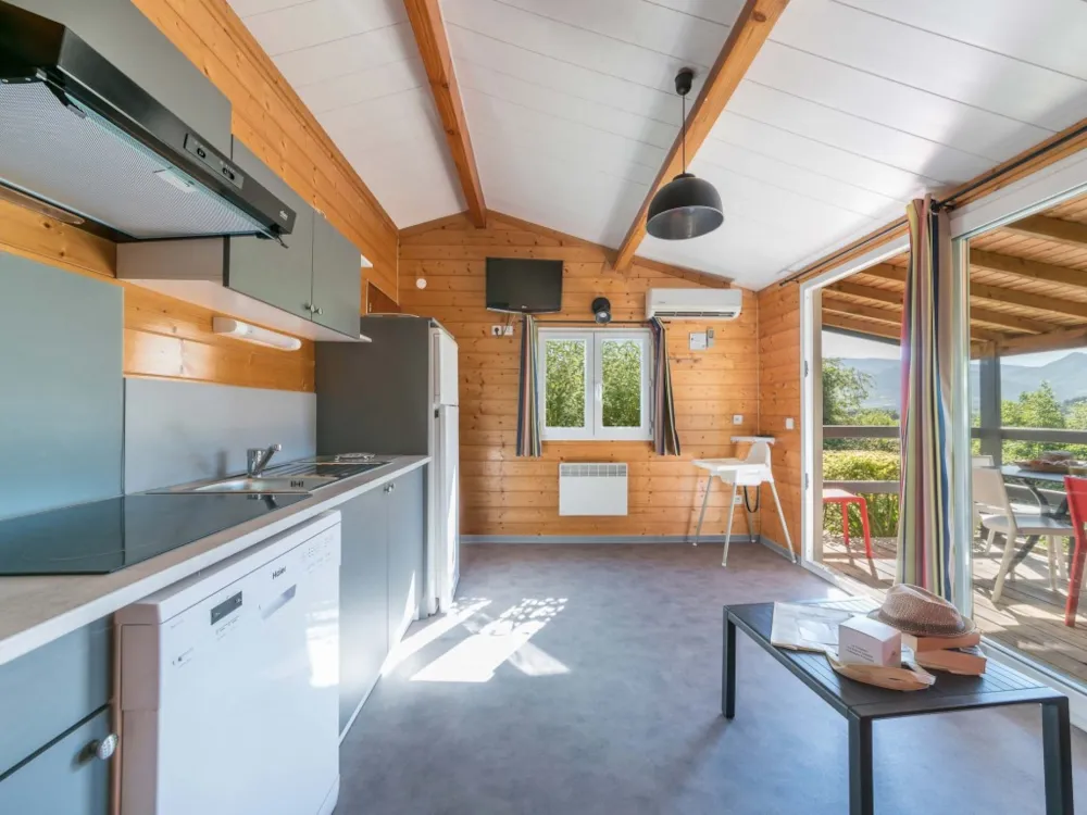 Le chalet était très bien. Une lumière au niveau de la terrasse au plafond serait top afin de profiter en soiree et mieux voir pour jouer en societe. Et personnellement je ne vois pas l utilite d une bouilloire mais un grille pain serait top. Le camping est tres bien aménagé Polo est genial en tant qur animateur par contre les autres sont quasi inexistant. Le personnel du restaurant est incompétent extrêmement lent pas de memoire ( 1h30 pour etre servi d une pizza 2 burgers et 2 paella) Et 20 min un autre jour pour avoir 2 cocktail (nous etio's premier a etre servi)