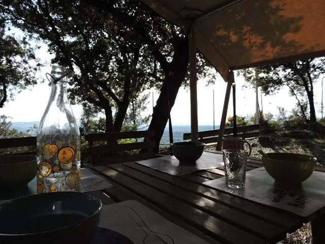 Tente lodge aménagée – 2 chambres – Vue panoramique sur l’Enclave des Papes (année 2015)