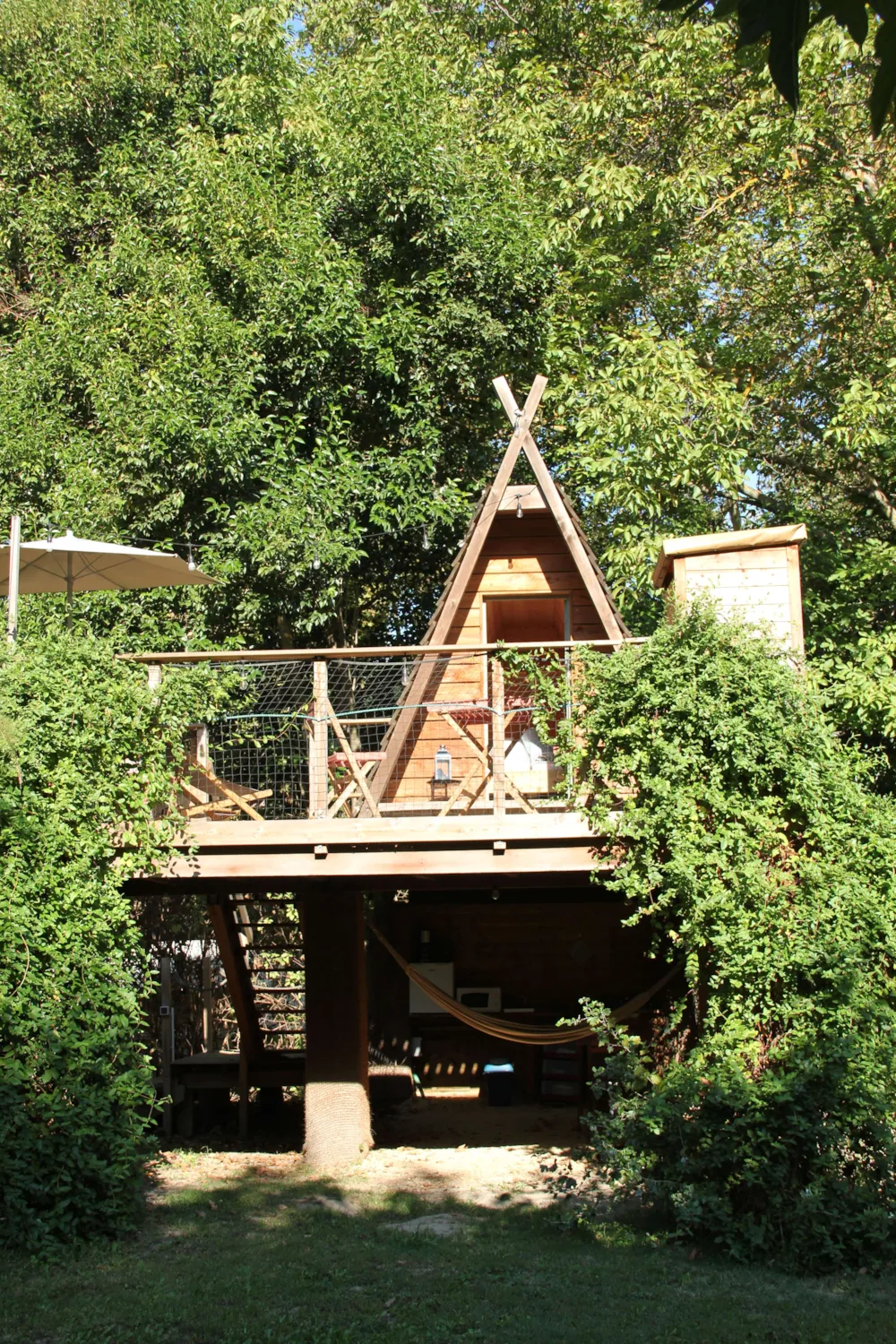 Cabane perchée doux bruit d'eau de source coulant à proximité terrasse avec 2 fauteuils couchage double (lit en 160x200) et étagère de rangement wc privé et kitchenette privée table de pic-nic Accès au bâtiment sanitaire entièrement rénové Caution de 500 euros en espèces ou par empreinte carte bancaire non débitée